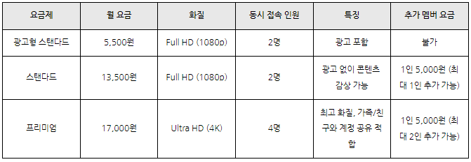 넷플릭스는 사용자의 필요와 예산에 맞게 다양한 요금제를 제공합니다. 기본 요금제는 HD 화질을 지원하며, 한 명이 동시에 시청할 수 있습니다. 이 요금제는 개인적으로 넷플릭스를 즐기고자 하는 사용자에게 적합합니다. 스탠다드 요금제는 Full HD 화질을 지원하며, 동시에 두 명이 시청할 수 있어 가족이나 친구와 함께 이용하기에 좋습니다. 프리미엄 요금제는 최고 화질인 4K를 지원하며, 최대 네 명이 동시에 시청할 수 있습니다. 이 요금제는 대가족이나 여러 명이 함께 계정을 공유할 경우 유리합니다. 요금제는 언제든지 계정 설정에서 업그레이드 또는 다운그레이드가 가능하니, 사용 환경에 맞게 조정해 보세요.
